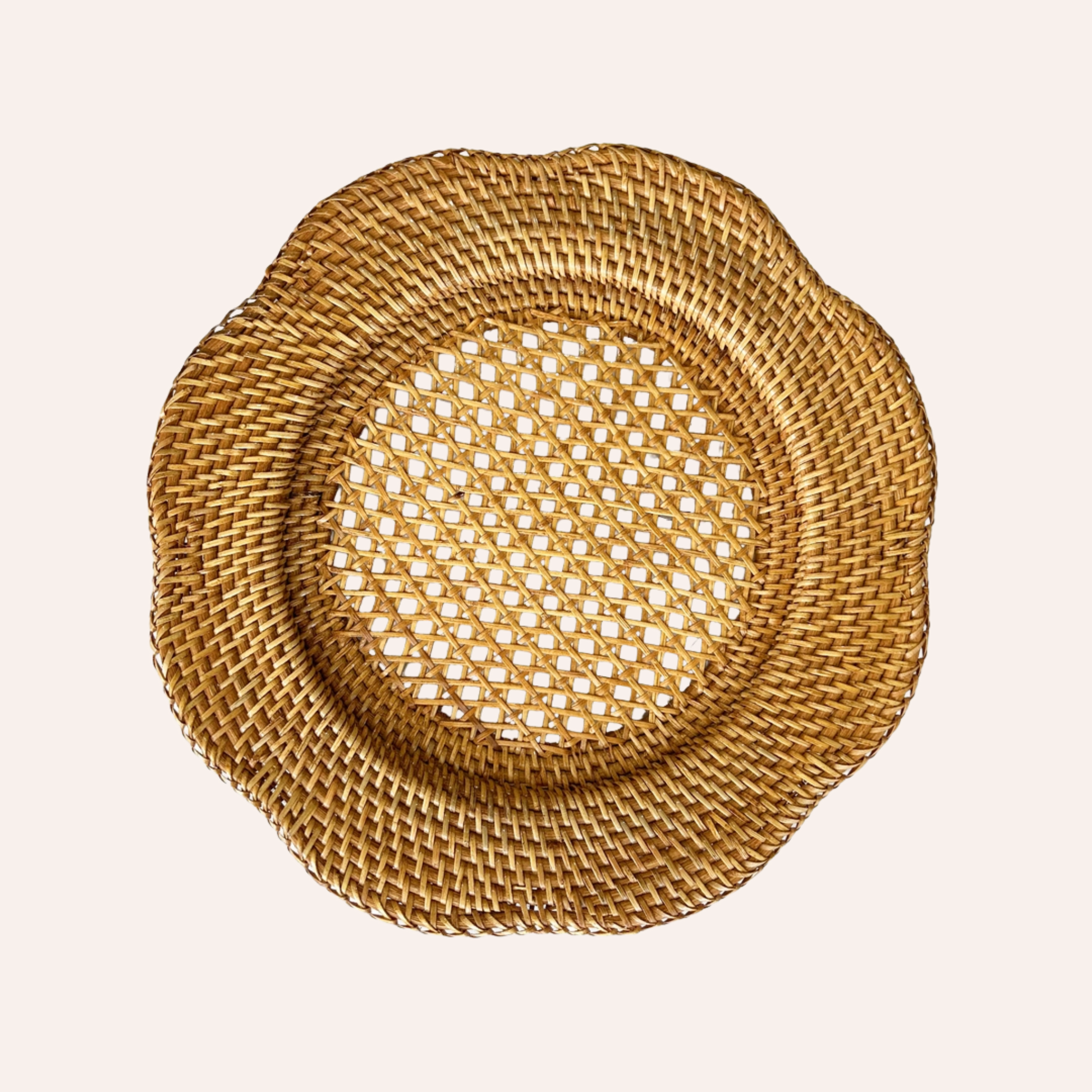 Handwoven in Bali from natural, sustainable rattan. The scalloped edge and airy cane lattice add texture and elegance to any setting. Lightweight, durable, and reusable - designed to help you style unforgettable tablescapes.